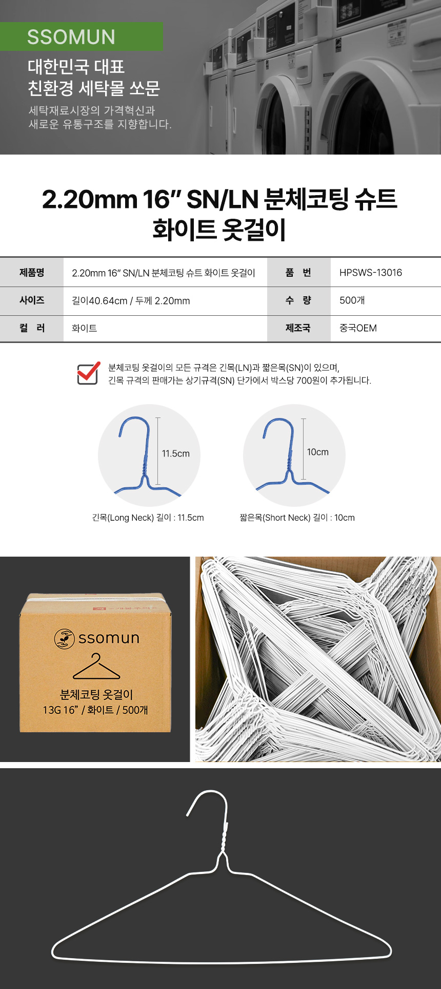 2.20mm 16" SN/LN 분체코팅 슈트 옷걸이 화이트 500개
