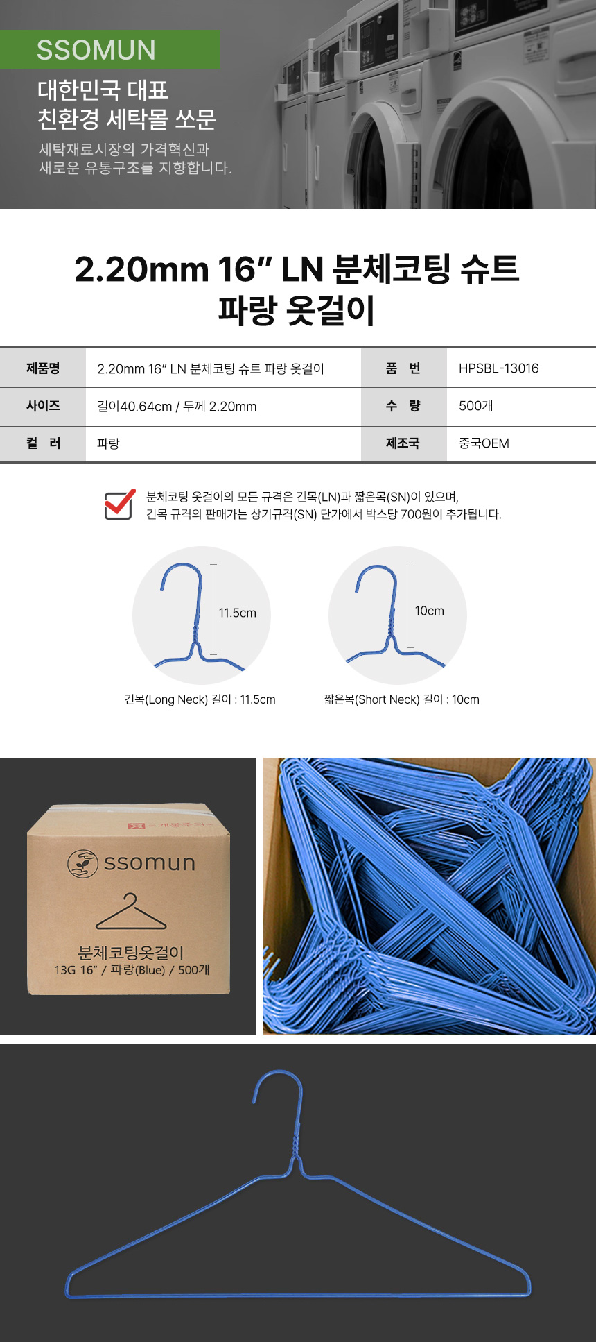 2.20mm 16" LN 분체코팅 슈트 옷걸이 파랑 500개