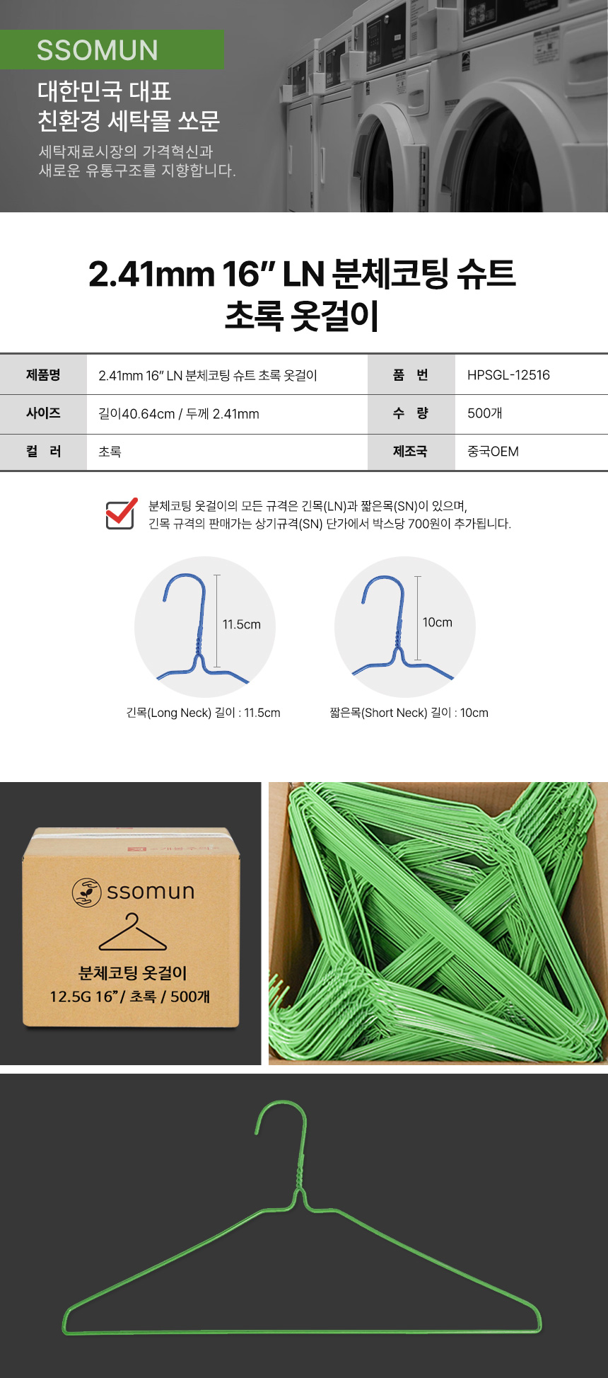 2.41mm 16" LN 분체코팅 슈트 옷걸이 초록 500개